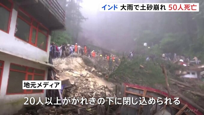 インド北部のヒマチャルプラデシュ州では14日までに大規模な土砂崩れが発生しました。地元メディアによりますと、大雨の影響で現地では土砂崩れが相次ぎ、これまでに50人を超える人が死亡しています。また、20人以…
