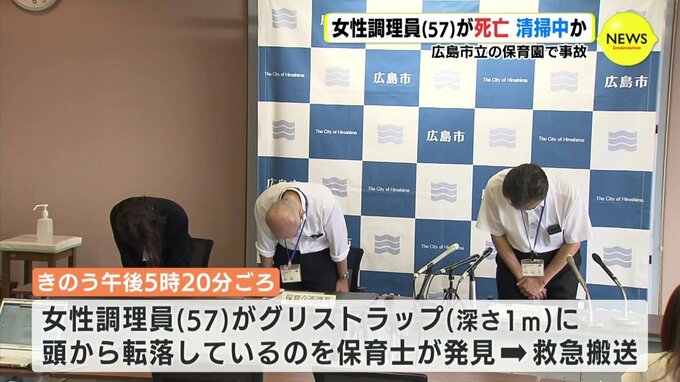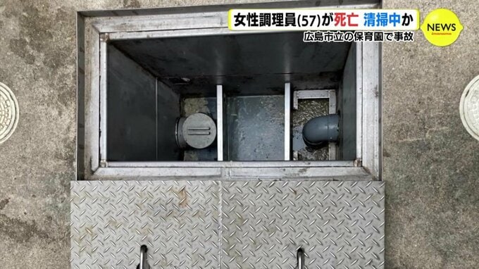 広島市によりますと、14日午後5時20分ごろ、57歳の女性調理員が、給食室外の地面に設置されている深さ1mのグリストラップに、頭から転落しているのを、保育士が発見。救急搬送されましたが、病院で死亡が確認されました。死因は溺死だったということです。