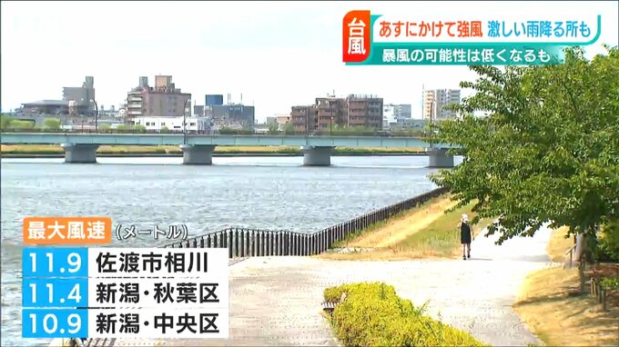 新潟地方気象台によりますと、台風7号は新潟県内に接近する可能性は低くなり、暴風となる可能性も低くなりました。それでも、朝から風は強まり新潟市中央区や秋葉区佐渡市相川では風速10メートルを超えるやや強い風が吹きました。