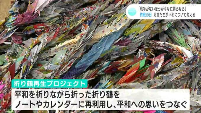 さらに子どもたちは、全国の生協が行っている「折り鶴再生プロジェクト」も体験しました。これは、平和を祈りながら折った折り鶴をノートやカレンダーに再利用することで平和への思いをつないでいく取り組みです。