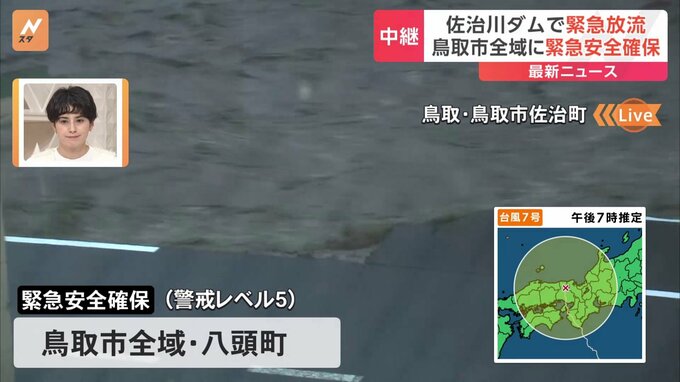 警戒レベル5「緊急安全確保」が発令されている鳥取市佐治町です。だいぶ暗くなってきましたが、雨は激しく降り続いています。目の前の佐治川では轟音とともに濁流がとめどなく流れてきています。道路の先のほうは…