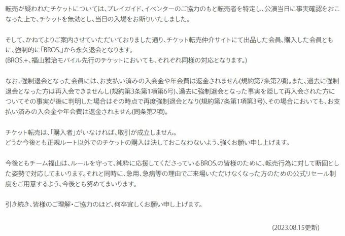 そして「転売が疑われたチケットについては、プレイガイド、イベンターのご協力のもと転売者を特定し、公演当日に事実確認をおこなった上で、チケットを無効とし、当日の入場をお断りいたしました」」と厳正な対応をとったことを明かし、さらに「チケット転売仲介サイトにて出品した会員、購入した会員ともに、強制的に「BROS.」から永久退会となります」と、5月の掲載で告知していたとおりに「永久退会」「強制退会」という厳しい対応をとることを宣言しています。