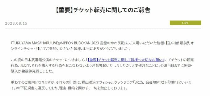 公式サイトでは、今年5月29日に掲載された「【重要】チケット転売に関して皆様へ大切なお願い」という記事を振り返り「チケットの転売行為、および、それを購入する行為をおこなわないよう注意喚起いたしましたが、大変残念なことに、公演当日までに転売・購入が複数件発覚しました」と報告。それらの行為はファンクラブ会員規約で一切が禁止されていることを強調しました。