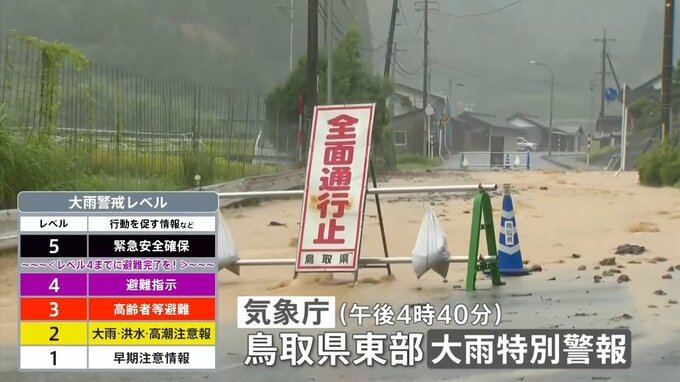 気象庁は15日午後4時40分、鳥取県東部に大雨特別警報を発表。5段階のうち最も警戒レベルが高い情報です。