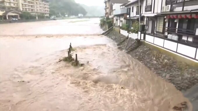 「三朝町に来ています。町内を流れる川は濁流になっています。こちらには露天風呂があったということなんですが、脱衣所が跡形もなく流されてしまっています」