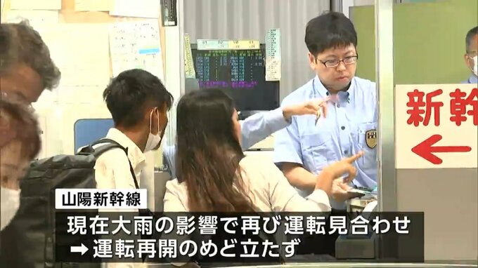 山陽新幹線は、静岡県の三島~静岡間で雨のため運転を見合わせている影響で、再び上り下りで運転をストップしていて、運転再開の目途は立っていません。