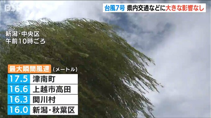 台風7号は午前9時現在、石川県の能登半島沖にあり、新潟地方気象台によりますと当初の予想より西へ進んでいて、新潟県内に接近する可能性は低くなりました。それでも朝から風は強まり、新潟県津南町や上越市で最大瞬間風速16メートルを超える風が吹きました。