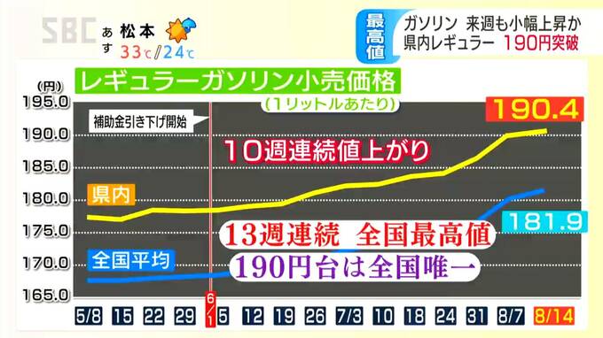 13週連続で全国で最も高く、平均価格が190円台に達したのは長野県だけです。