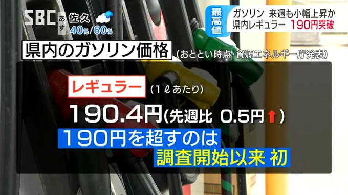 長野県内の今週のガソリン価格は、レギュラーの平均が調査開始以来、初めて1リットル190円を超えました。
