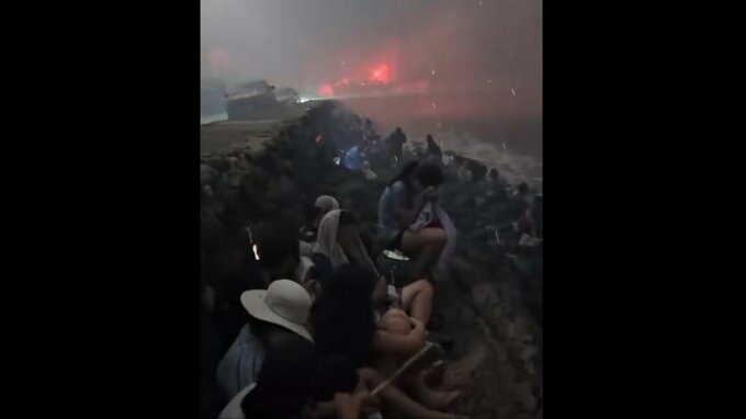 波打ち際の岸壁には、迫りくる熱と炎から逃れようと多くの人が身を寄せる様子も…。