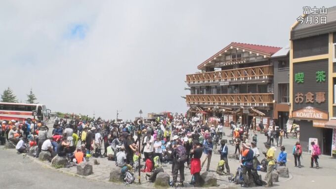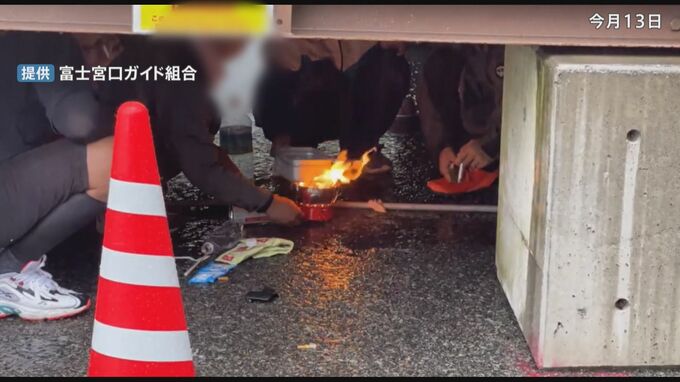 8月13日、5合目にある仮設休憩所のプレハブの下で、火を使って料理をする外国人の姿が。手には、タバコも持っています。このときプレハブの中は、シャトルバス待ちの客で満員だったといいます。