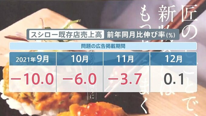 業界トップのスシローですが、2020年にはコロナ禍で売り上げが大きく減少。その後は売り上げが改善していましたが、問題の広告を出していた期間は再び売り上げが落ち込んでいました。