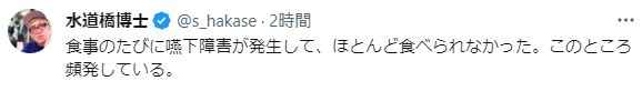 水道橋博士さんは「食事のたびに嚥下障害が発生して、ほとんど食べられなかった。このところ頻発している。」と投稿。ひとつ前の投稿では「昨日。昼前、電動自転車発。途中、冷やしうどん。」と記しており、新居への引っ越し作業をこなした後「3人で焼き肉屋さん打ち上げ。」としていて、食事を摂ろうとしている様子がうかがえます。