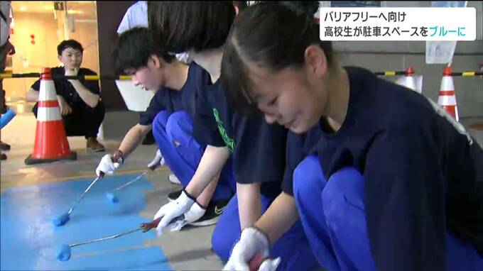 バリアフリーへの理解を深めようと17日、仙台市の高校生らが車いすを利用する人などのために商業施設の駐車場を青く塗装しました。青葉区のエスパル仙台東館6階駐車場で行われた「ブルーペイント大作戦」には、こ…