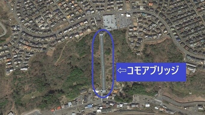 「コモアブリッジ」といい、その中には斜行エレベーター2基とエスカレーターがあり、駅と標高350mにある住宅地を結んでいます。