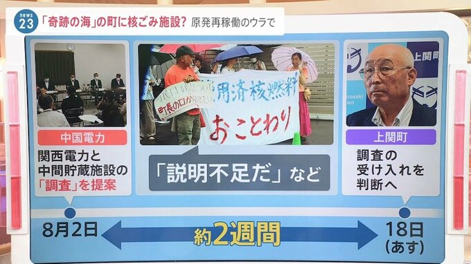 そうした中で、中国電力は関西電力とともに、中間貯蔵施設の設置に向けた調査をすることを8月2日に上関町に提案したわけです。上関町は18日に調査を受け入れるかどうか判断する予定ですが、住民からは「説明不足」といった反対の声が上がっています。