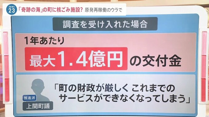 ただ、この調査を受け入れると1年間で最大1.4億円の交付金が入ります。推進派の町議の1人に話を聞くと、人口減少や高齢化が進む中で「町の財政が厳しく、これまでのサービスができなくなってしまう」と、交付金のメリットについても大きいと話しているそうです。