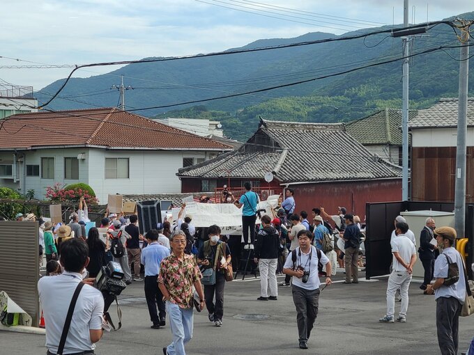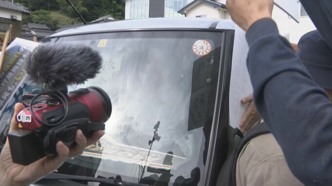 午前8時半頃、役場に西哲夫町長が到着すると、計画に反対する人たちが車を取り囲みました。
