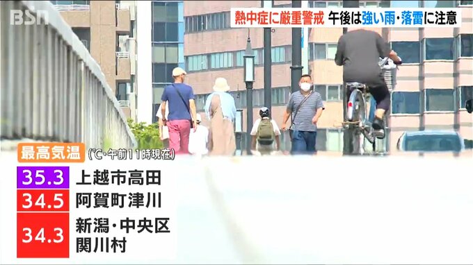 18日の新潟県内は各地で気温が上がり、午前11時現在の最高気温は上越市高田で35.3℃、阿賀町津川で34.5℃、新潟市中央区と関川村で34.3℃となっています。