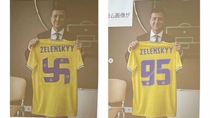 左側は2022年3月、ロシアのウクライナ侵攻が始まったおよそ1か月後にSNS上で拡散した画像です。ウクライナのゼレンスキー大統領が、ナチスのシンボルがプリントされたTシャツを手に微笑んでいます。