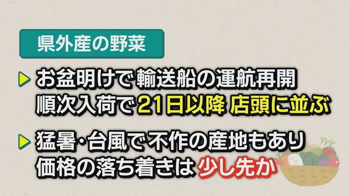 まず県外産の野菜は「きのう、おとといでお盆が開けて、本格的に輸送船の運航も再開していることなどから順次入荷。来週21日月曜日には店頭に並ぶだろう。ただ、猛暑や台風などで不作のところもあり、小売り価格が落ち着くのはもう少し時間がかかると推測する」としています。