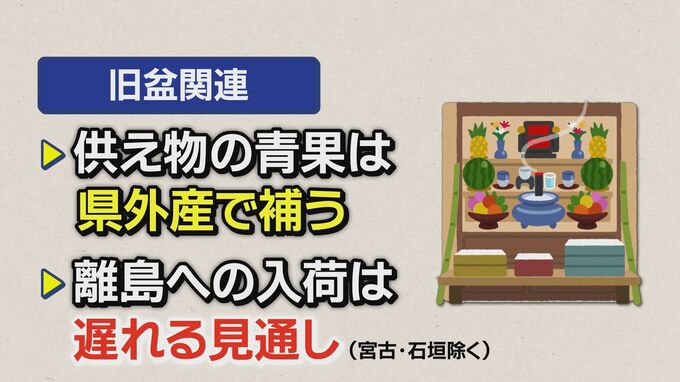 一方、県産野菜については「ゴーヤーやオクラ、葉野菜は次の入荷まで早くても2~3週間、最大で1か月以上かかる農家もあるだろう。スイカやバナナ、パインなど旧盆で使うお供えものの果物などは、県外産で補填し対応する。ただ、宮古・石垣を除く離島の入荷は遅れる可能性がある」ということです。