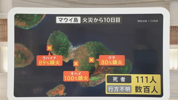大きく火災が発生したのは、3つの場所。「クラ」では80%鎮火。「キヘイ」では100%鎮火。特に大きな被害を受けたという「ラハイナ」ではまだ89%の鎮火となっています。