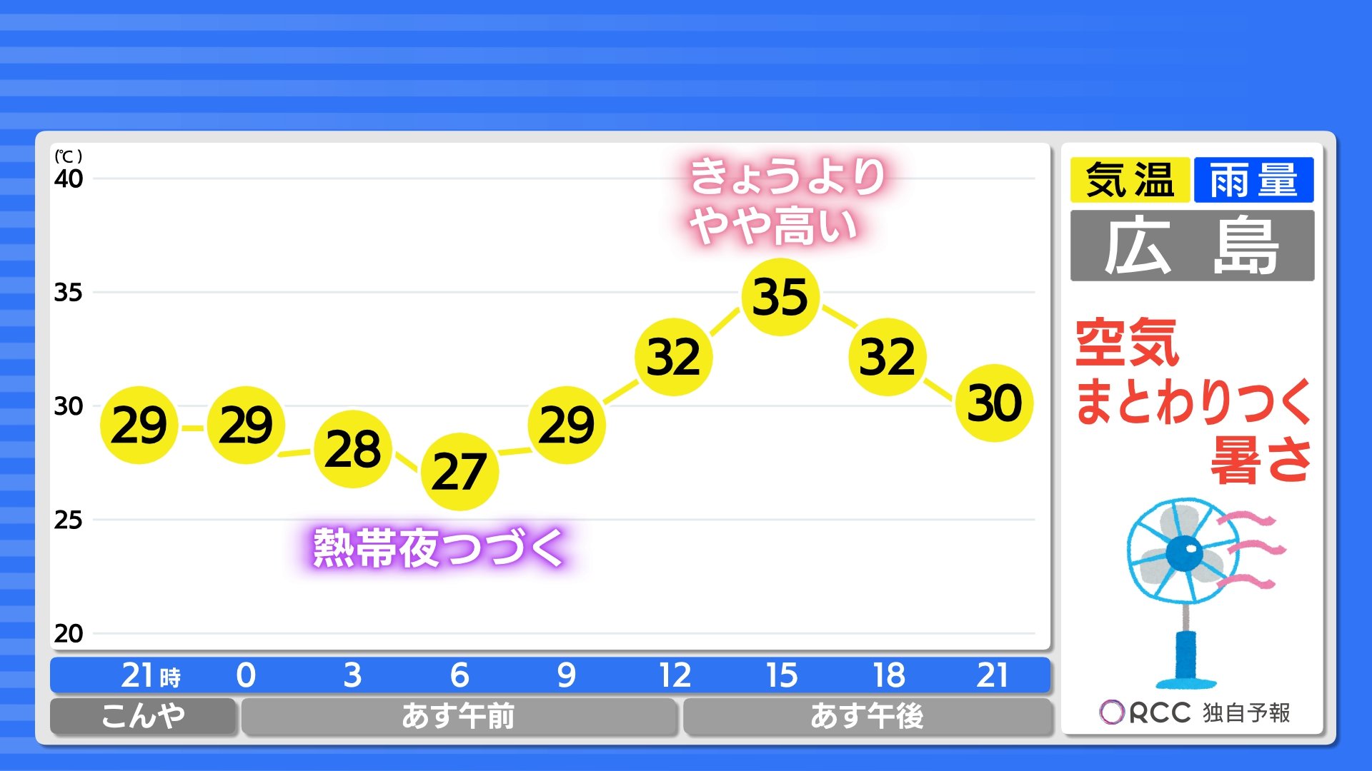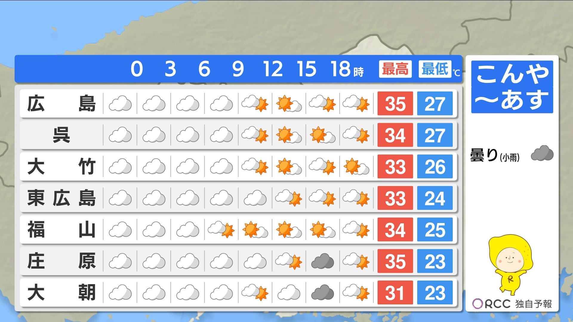 広島県には熱中症警戒アラートが発表されています。厳重に警戒してください。風は弱く波は穏やかでしょう。