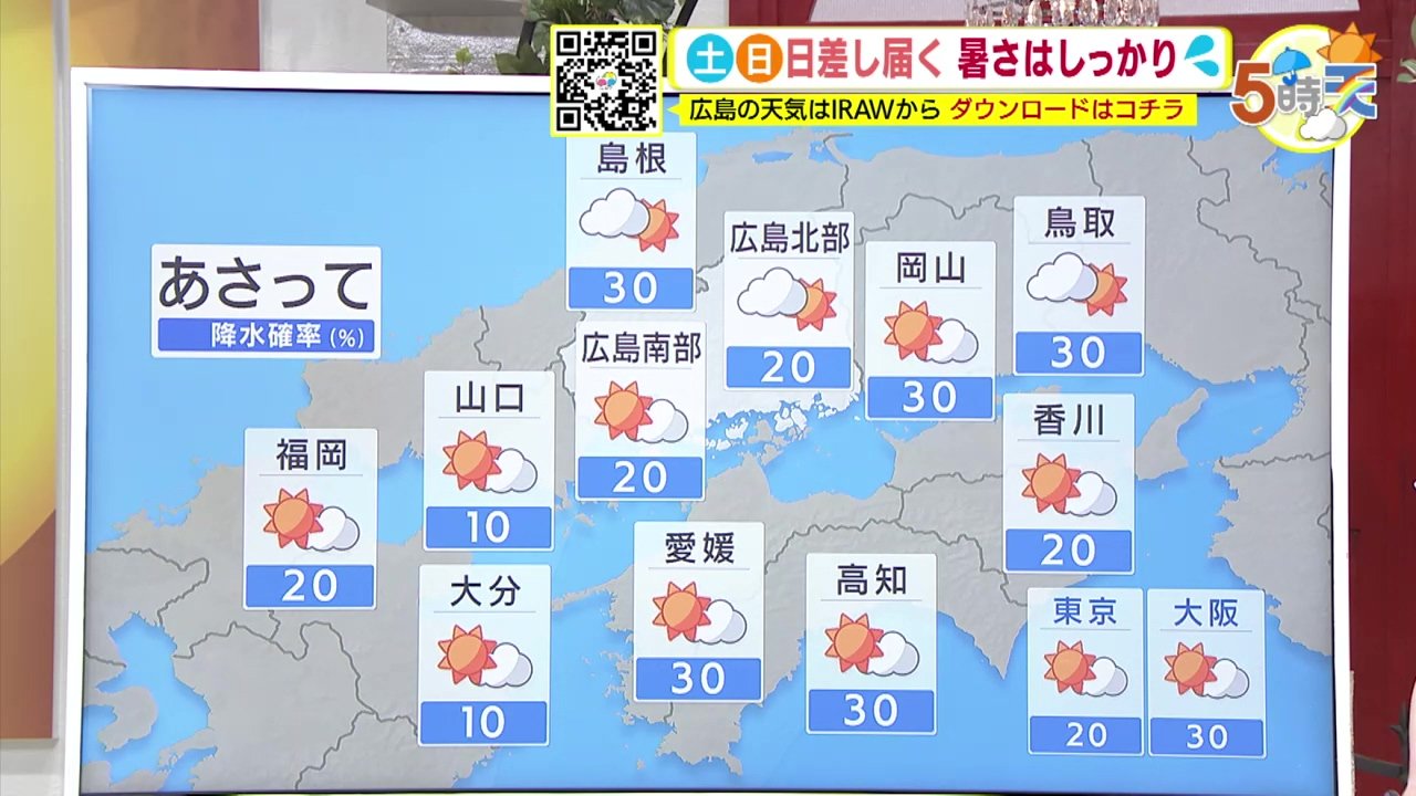 土日はきょうまでに比べると夏の高気圧が強まるために中国地方は高気圧の圏内となります。雲は多めですが日中は日差しが出るでしょう。