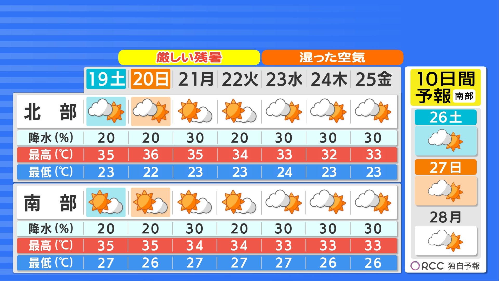 あす19日(土)の気温は、朝は沿岸部では熱帯夜となります。昼間は一部で35℃前後まで上がり猛暑日となるる所もあるでしょう。湿度も高く蒸し暑くなります。