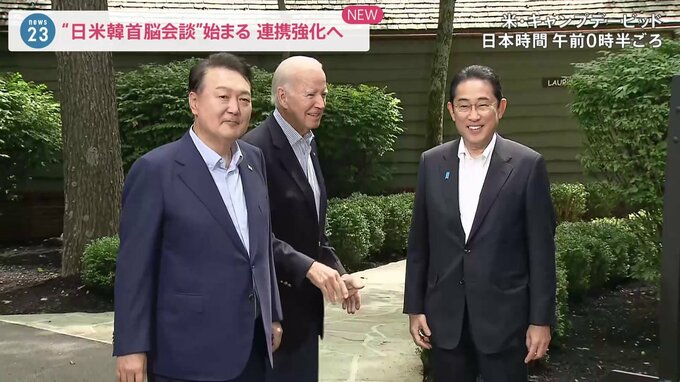 アメリカ・ワシントン郊外の山荘「キャンプデービッド」では、先ほどから日米韓首脳会談が行われています。会談が始まる前、アメリカのバイデン大統領が岸田総理と韓国のユン大統領を笑顔で出迎えました。そして、…