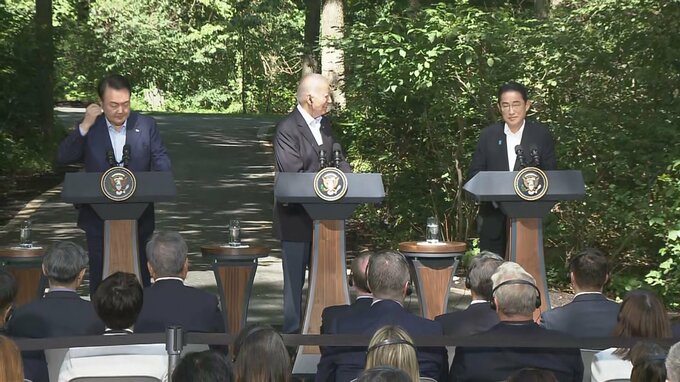 日本・アメリカ・韓国3か国の首脳はアメリカのワシントン郊外で会談し、中国や北朝鮮への対応を念頭に安全保障をはじめ、幅広い分野で協力を強化する「キャンプデービッド原則」で合意しました。現地から中継です…