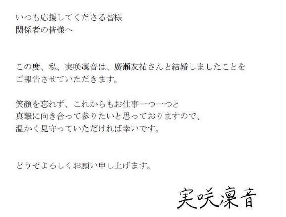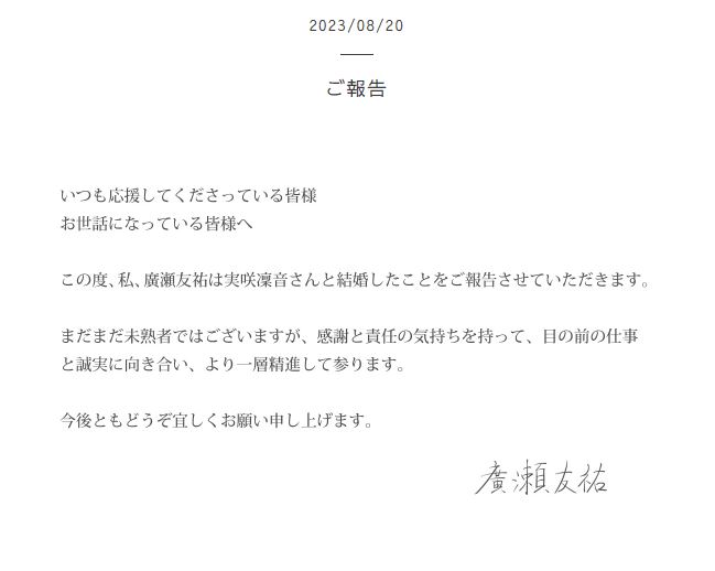 廣瀬さんは「まだまだ未熟者ではございますが、 感謝と責任の気持ちを持って、 目の前の仕事と誠実に向き合い、より一層精進して参ります。」と自身の公式サイトで、直筆の署名と共に報告。