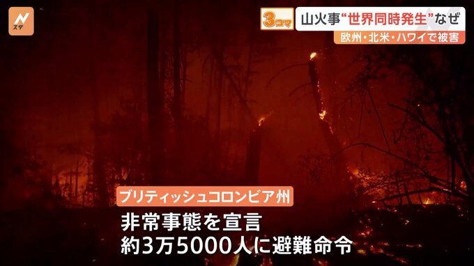 世界各地で相次ぐ山火事。カナダでは非常事態が宣言され、軍が出動する事態となっています。AP通信によりますと、カナダでは今年、全土で5700件以上の火災が発生し、およそ14万平方キロメートルの森林が燃えました…