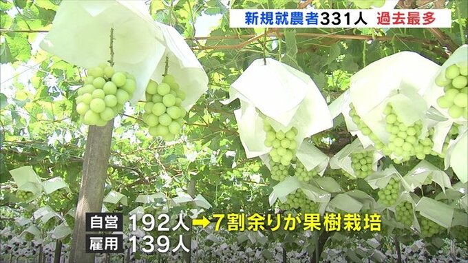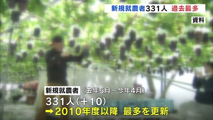 山梨県によりますと去年5月から今年4月までに県内で新たに農業を始めた人は331人で、前の年より10人増え今の方法で調査を始めた2010年度以降、最多を更新しました。