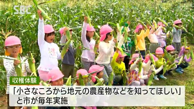 収穫体験は小さなころから地元の農産物などを知ってもらおうという取り組みで、収穫の後、子どもたちは採れたてを味わったほか保育園のおやつの時間にみんなで食べるトウモロコシも持ち帰りました。