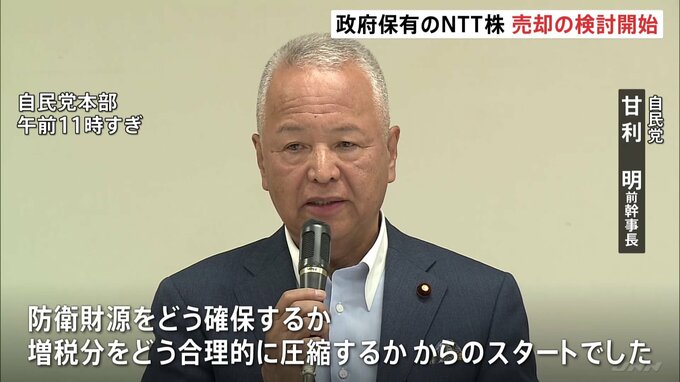 防衛費増額の財源確保に向け、自民党はきょう、政府が保有するNTT株の売却を検討するプロジェクトチームの役員会を初めて開き、議論を開始しました。自民党 甘利明 前幹事長「防衛財源をどう確保するか、増税分…