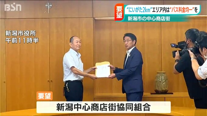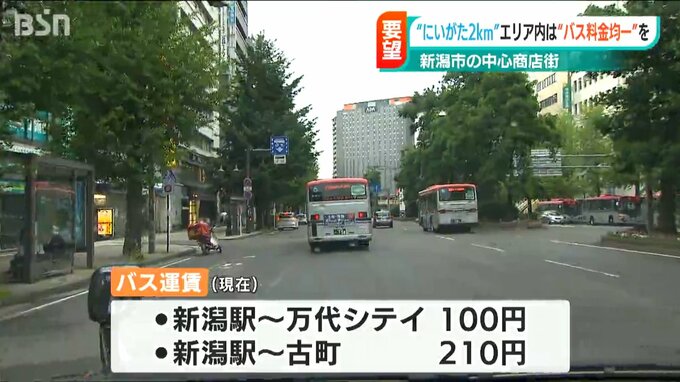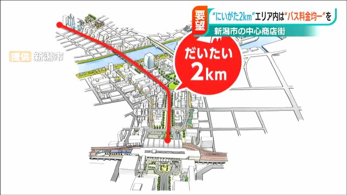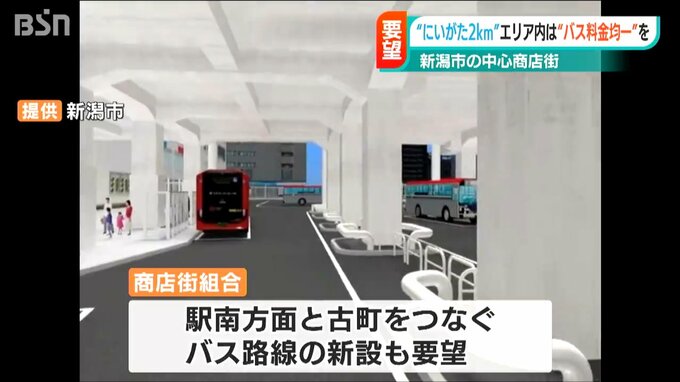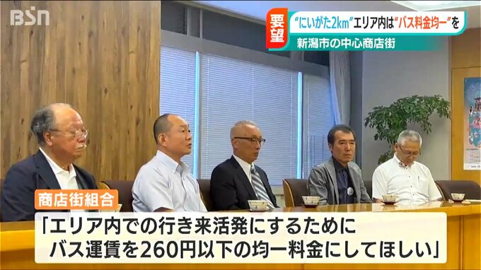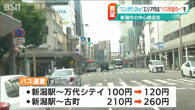 新潟駅・万代・古町の「にいがた2km」のにぎわい作りには、利用しやすい公共交通が欠かせないと新潟市の中心商店街が、バス料金の均一化などを新潟市に要望しました。