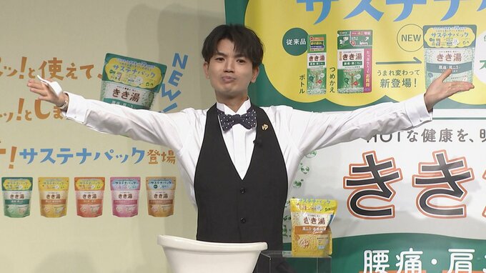 SixTONESの髙地優吾さんがバスクリンの「きき湯」新パッケージ“サステナパック”発表会に登場しました。お風呂と温泉好きとして知られ、「温泉ソムリエ」の資格も持つ髙地さんは、今秋から放送される「きき湯」の新CMに出演します。