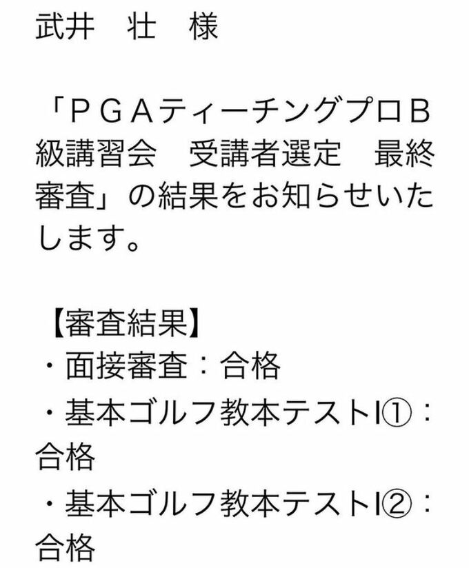 武井さんは今年7月に群馬県高崎市のサンコーカントリークラブで2日間にわたって開催された日本ゴルフ協会(PGA)主催のティーチングプロ資格のB級実技審査に挑戦し、79、75のトータルスコア154、51位タイの成績で終え、見事実技テストに合格していました。