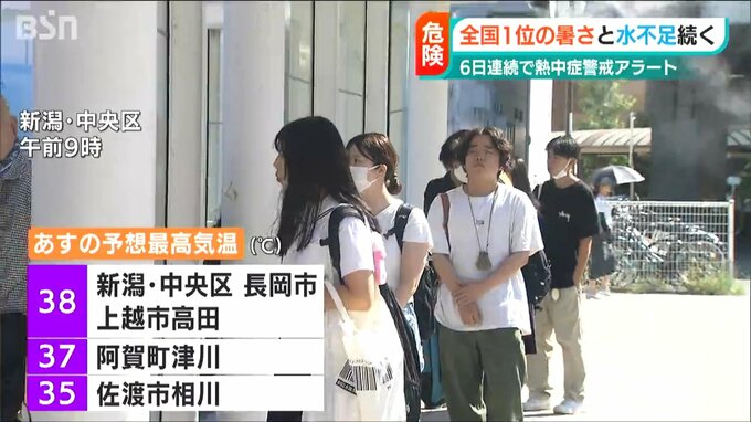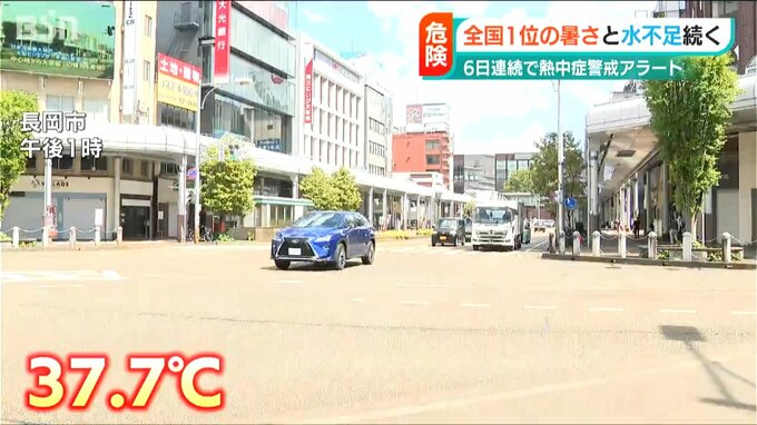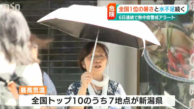 6日連続で熱中症警戒アラートが発表された22日の新潟県内。全国の最高気温トップ10のうち、ほとんどを新潟県が占めました。また、ダムの貯水率が0パーセントの状態が続くところもあり、水不足も深刻です。