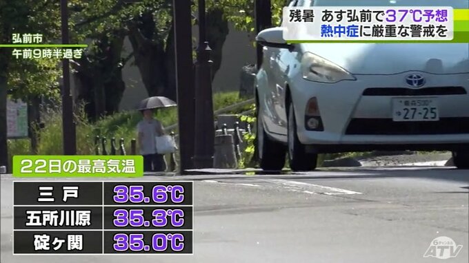 県内は22日も高気圧に覆われて気温が上がり、日中の最高気温は、三戸で35.6℃、弘前で35.3℃など23の観測地点のうち3地点で35℃以上の猛暑日に。