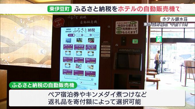 静岡県東伊豆町内のホテルに、その場で「ふるさと納税」ができる自動販売機が設置されました。東伊豆町が設置した「ふるさと納税」の自動販売機には、露天風呂付客室のペア宿泊券や特産キンメダイの煮つけなど、返…