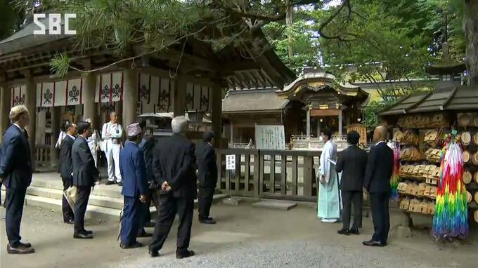 一行は24日午前中、諏訪市の諏訪大社上社本宮(ほんみや)を訪れ、神社の関係者などから、大社や境内の御柱などについて、説明を受けました。
