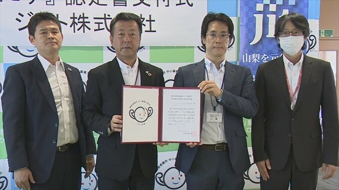 プリンター用のインクの製造などを手がける山梨県南アルプス市の「ジット」が、障害者の雇用に積極的な国の「もにす認定企業」に選ばれました。きょう24日には南アルプス市のジット本社で認定証の授与式が行われ、…