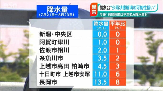 新潟市内では24日も雨が降りませんでした。梅雨明けから23日までの降水量です。新潟市中央区では0ミリで平年比0パーセント。佐渡市相川では2ミリで平年比1パーセント。上越市高田は4.5ミリで平年比3パーセントなど極端に雨が少なくなってい