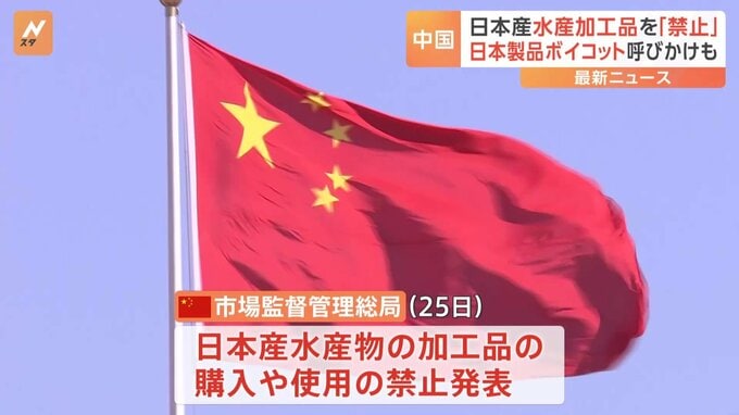 福島第一原発の処理水放出開始を受け、中国政府は日本産水産物の全面禁輸に続き、水産物の加工品の使用も禁止すると発表しました。中国の市場監督管理総局は先ほど、日本産水産物の加工品について、購入や使用を禁…