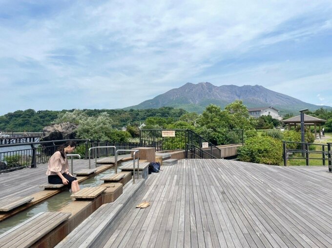 桜島の大パノラマのもと、自然と湧いて出る足湯は最高!