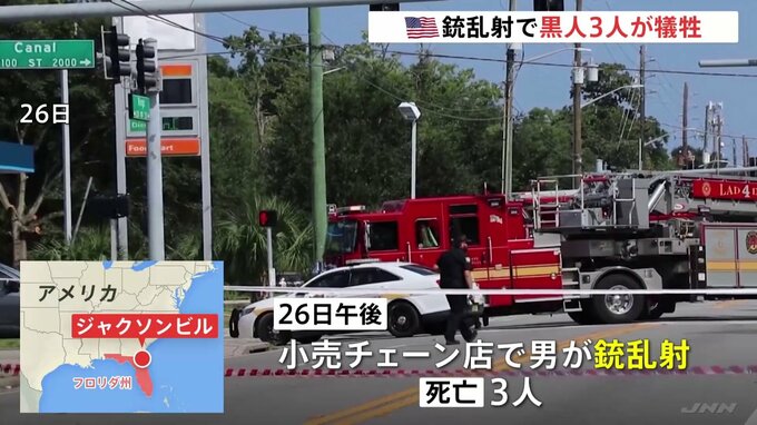 アメリカ南部フロリダ州の小売店で20代の白人の男が銃を乱射し、3人が死亡しました。犠牲者は3人とも黒人で、警察は「人種差別が動機」としています。AP通信などによりますと、フロリダ州ジャクソンビルの小売チェ…