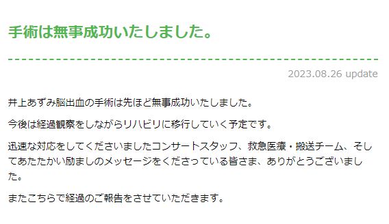 公式サイトでは「井上あずみ脳出血の手術は先ほど無事成功いたしました。今後は経過観察をしながらリハビリに移行していく予定です。」と報告。